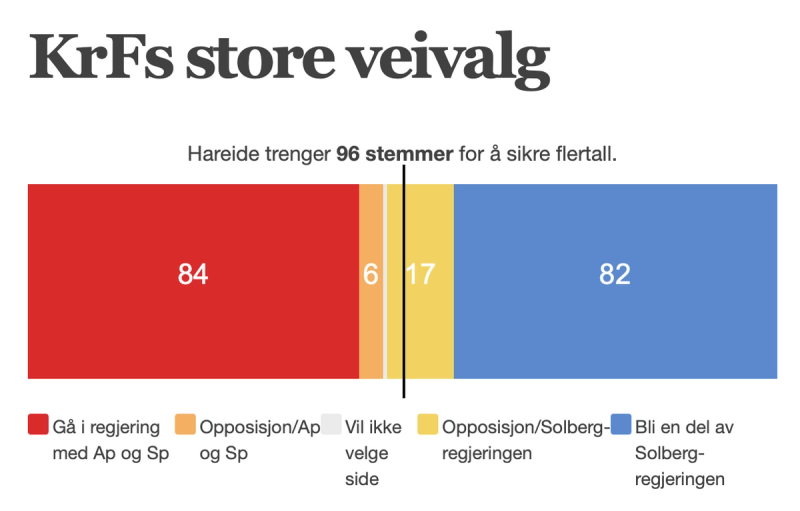 Mais l’évènement le plus marquant reste le thriller de fin 2018 déclenché par le parti chrétien-démocrate (KrF). Avec ses 4,2% de voix lors des dernières élections et ses 8 députés, le parti avait fait le choix de rester en dehors de toute coalition. Mais son chef de l’époque (Knut Arild Hareide) a suggéré de rejoindre la coalition de gauche avec Arbeiderpartiet (Ap) et (Senterpartiet) Sp et ainsi former une plus grosse coalition que celle menée par Erna Solberg, la Première ministre. L’aile droite de KrF est alors montée au créneau pour faire part de son opposition à ce projet, entrainant un vote extraordinaire le 2 novembre 2018 où les délégués devaient choisir entre rejoindre la coalition de gauche ou celle de droite et donc le gouvernement. Seuls les délégués élus par les fédérations comtales pouvaient voter. Le chef du parti et sa volonté de rejoindre la gauche ont perdu à 6 voix près. À 6 petites voix près donc, le gouvernement de Norvège aurait pu tomber en plein milieu de son mandat. À noter que pendant la campagne interne à KrF, Erna Solberg a spontanément fait une promesse aux délégués que s’ils votaient bleu, le gouvernement durcirait la loi sur l'avortement (jumeaux et foetus anormaux). Peut-être que cela a fait pencher la balance ? Dans tous les cas, plusieurs membres du KrF sont donc entrés au gouvernement par la suite.